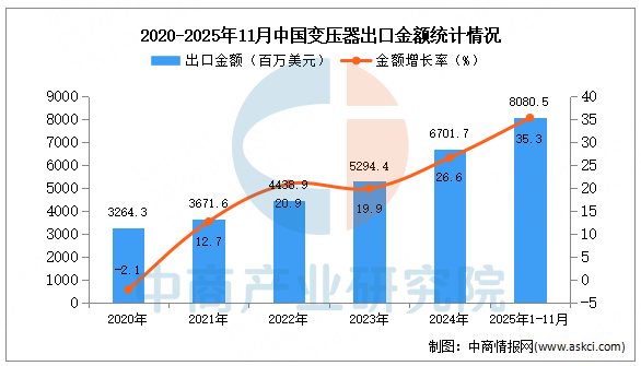 从市场规模看,2025年全球变压器市场规模约3324亿美元,其中海外市场约3200亿美元,中国市场720-900亿元人民币(约100-125亿美元),预计到2035年将达到6131亿美元,2025-2035年复合年增长率为6.31%。根据海关总署数据统计,2025年1-11月,我国变压器出口金额约80.8亿美元,同比增加35.3%。细分领域中,新能源配套变压器、数据中心专用变压器成为增长主力,预计2025-2030年全球可再生能源配套变压器年新增容量将占总新增容量的近四成。据Rystad Energy预测,全球变压器供应紧缺情况至少将持续到2026年底。
