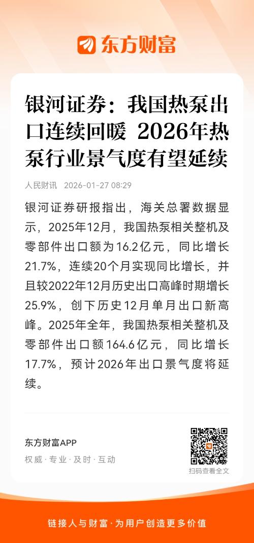 银河证券研报指出,海关总署数据显示,2025年12月,我国热泵相关整机及零部件出口额为16.2亿元,同比增长21.7%,连续20个月实现同比增长,并且较2022年12月历史出口高峰时期增长25.9%,创下历史12月单月出口新高峰。2025年全年,我国热泵相关整机及零部件出口额164.6亿元,同比增长17.7%,预计2026年出口景气度将延续。推广热泵采暖是2050年碳中和目标的重要抓手,国际能源署预计至2050年,热泵将满足全球超半数采暖需求,市场规模可达万亿级别,装机量有望提升至2023年的3.3—4.3倍。欧盟设定2030年达到6000万台热泵保有量的战略目标,2024年保有量为2553.7万台,仍有3400多万台的缺口,据此测算,2024—2030年欧洲热泵保有量复合增速有望达15.3%,将带动我国热泵出口持续增长。研报预计需求将从整机端逐渐传导至核心零部件与控制系统端,形成全产业链共振,利好我国热泵整机及零部件出口企业,以及在欧洲暖通市场有并购标的的企业。