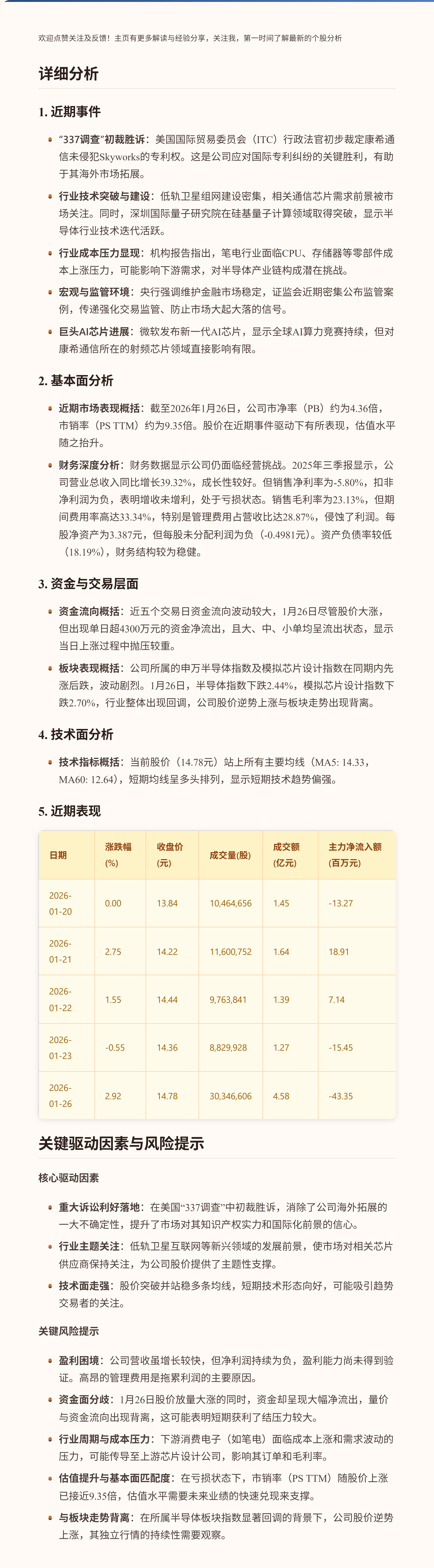 $康希通信(SH688653)$ 康希通信近期股价震荡上行,五个交易日累计上涨约6.8%。股价表现主要受到公司在美国“337调查”中初裁胜诉的积极消息驱动,这为其国际化战略扫除了关键障碍。同时,低轨卫星通信芯片等前沿领域的行业动态也提供了市场关注点。关键亮点在于公司成功应对重大国际专利纠纷,但财务数据显示其仍处于亏损状态。