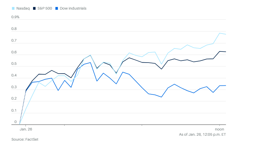 道指涨0.3%,距1月12日的收盘高点还差340点。距离5万点整数位也约有750点的差距。纳指涨0.7%,但距离去年10月29日的收盘高点仍有超过1%的差距。