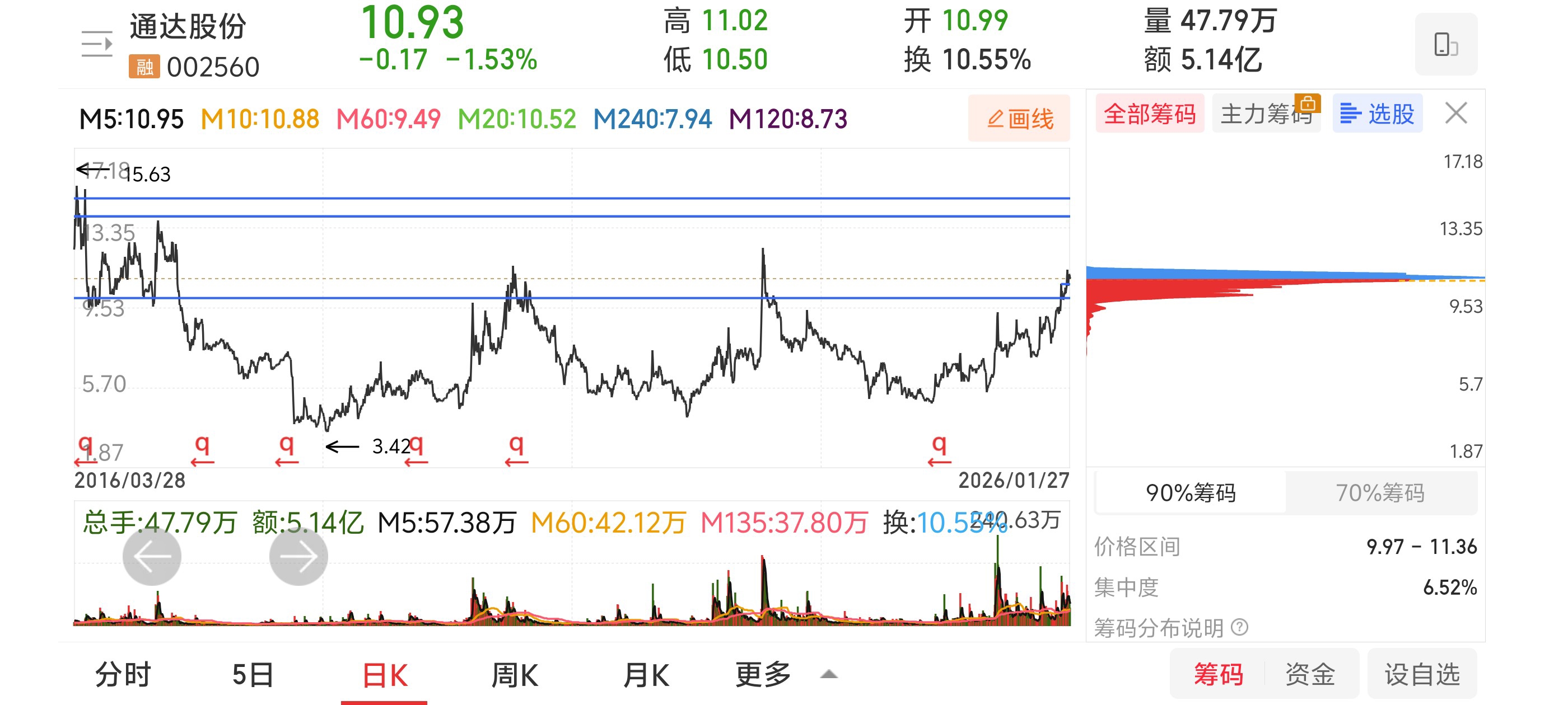 通达GF筹码呈单峰密集状,价格集中在10--11.30元区间。在业绩向好时,当下