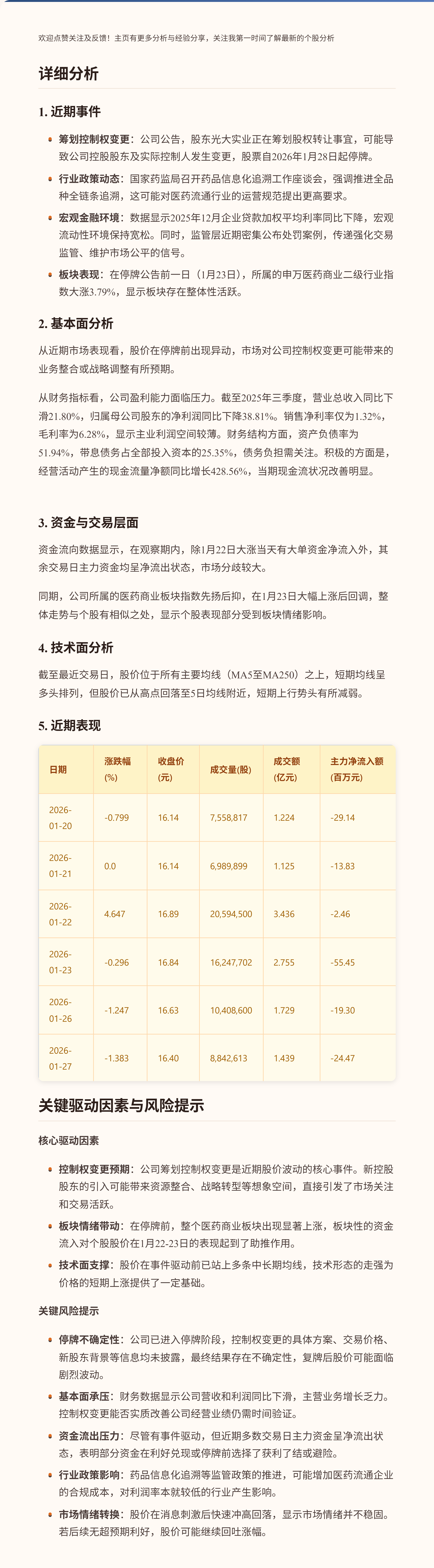 $嘉事堂(SZ002462)$ 嘉事堂股价在近期经历了一轮冲高回落,主要受到公司筹划控制权变更这一重大事件驱动。1月22日股价放量大涨4.65%,但随后三个交易日连续回调,显示市场情绪在消息明朗前趋于谨慎。关键点在于,公司股票将于1月28日起停牌,等待控制权变更事项的最终结果。