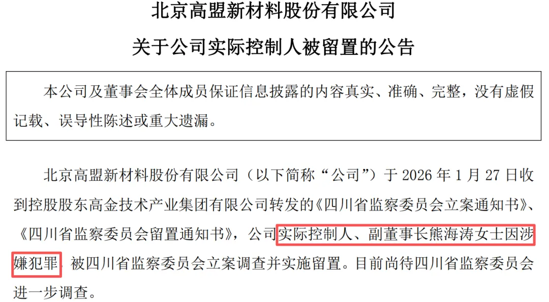 高盟新材公告,于2026年1月27日收到控股股东高金技术产业集团(以下简称高金集团)转发的《四川省监察委员会立案通知书》、《四川省监察委员会留置通知书》,公司实际控制人、副董事长熊海涛因涉嫌犯罪,被四川省监察委员会立案调查并实施留置。目前尚待四川省监察委员会进一步调查。