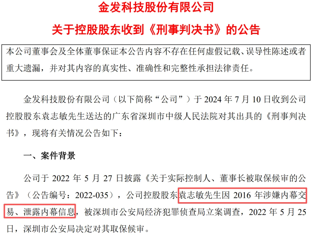 值得一提的是,袁志敏也曾因犯内幕交易罪被判刑。2024年7月11日晚金发科技公告,于2024年7月10日收到公司控股股东袁志敏送达的广东省深圳市中级人民法院对其出具的《刑事判决书》。判决书显示,袁志敏犯内幕交易罪,判处有期徒刑三年,缓刑四年,并处罚金90万元。
