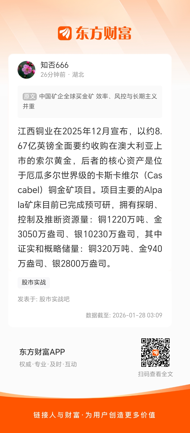 江西铜业也在加码布局黄金,公司在2025年12月宣布,以约8.67亿英镑全面要约收购在澳大利亚上市的索尔黄金,后者的核心资产是位于厄瓜多尔世界级的卡斯卡维尔(Cascabel)铜金矿项目。项目主要的Alpala矿床目前已完成预可研,拥有探明、控制及推断资源量:铜1220万吨、金3050万盎司、银10230万盎司,其中证实和概略储量:铜320万吨、金940万盎司、银2800万盎司。