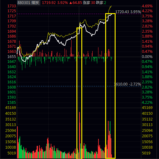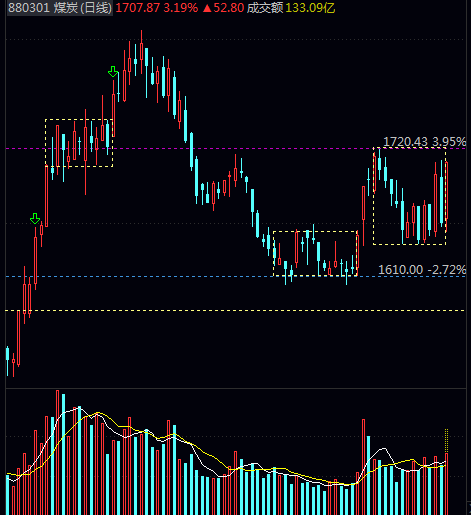 **煤业,伴随板块指数触及调整区间上方位置时,再次放量创日内高点处,卖出刚才加仓股数
