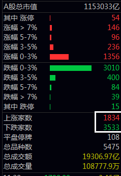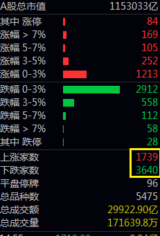 细节:白红黄绿,跌多涨少的强分歧格局,通过黄白线分时走势,3万亿成交指明今天资金流向,