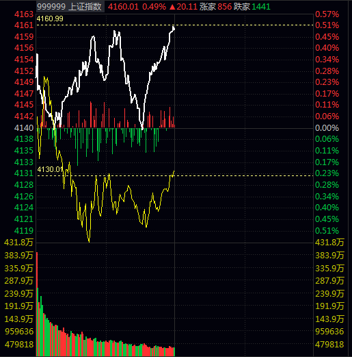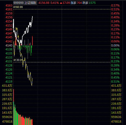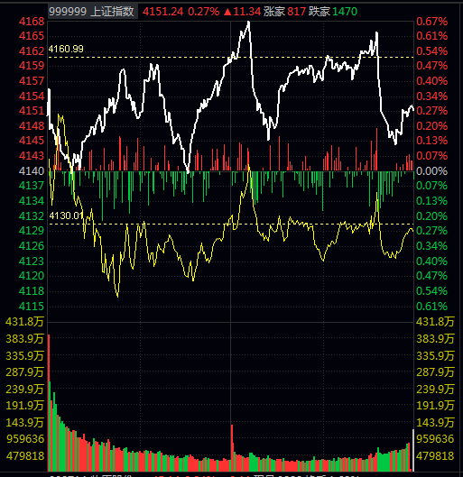 指数回补跳空缺口。再次反弹,黄白线来回过山车,早盘资金博弈剧烈