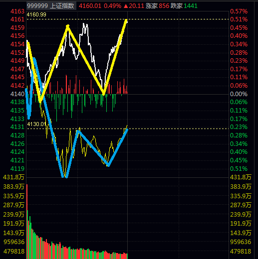 从开盘的白高黄低,在白线短期快速上拉后拐头下行,黄线却在急速下坠后快速反身上行,目前黄白已经交叉,黄上白下