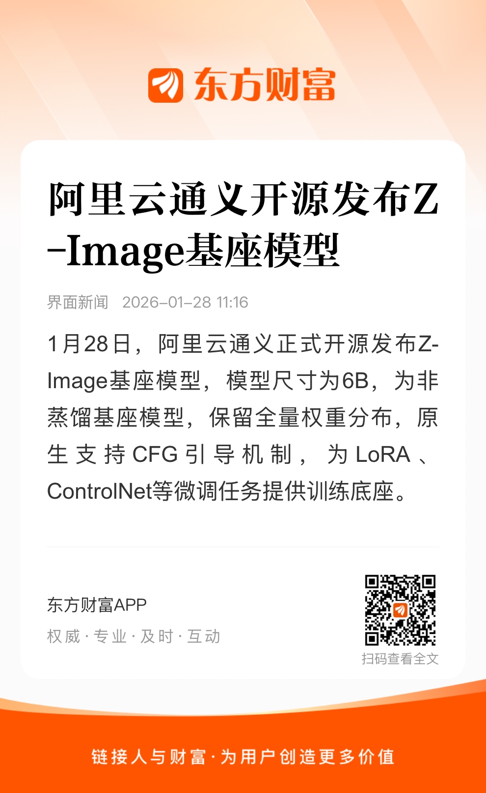 1月28日,阿里云通义正式开源发布Z-Image基座模型,模型尺寸为6B,为非蒸馏基座模型,保留全量权重分布,原生支持CFG引导机制,为LoRA、ControlNet等微调任务提供训练底座。