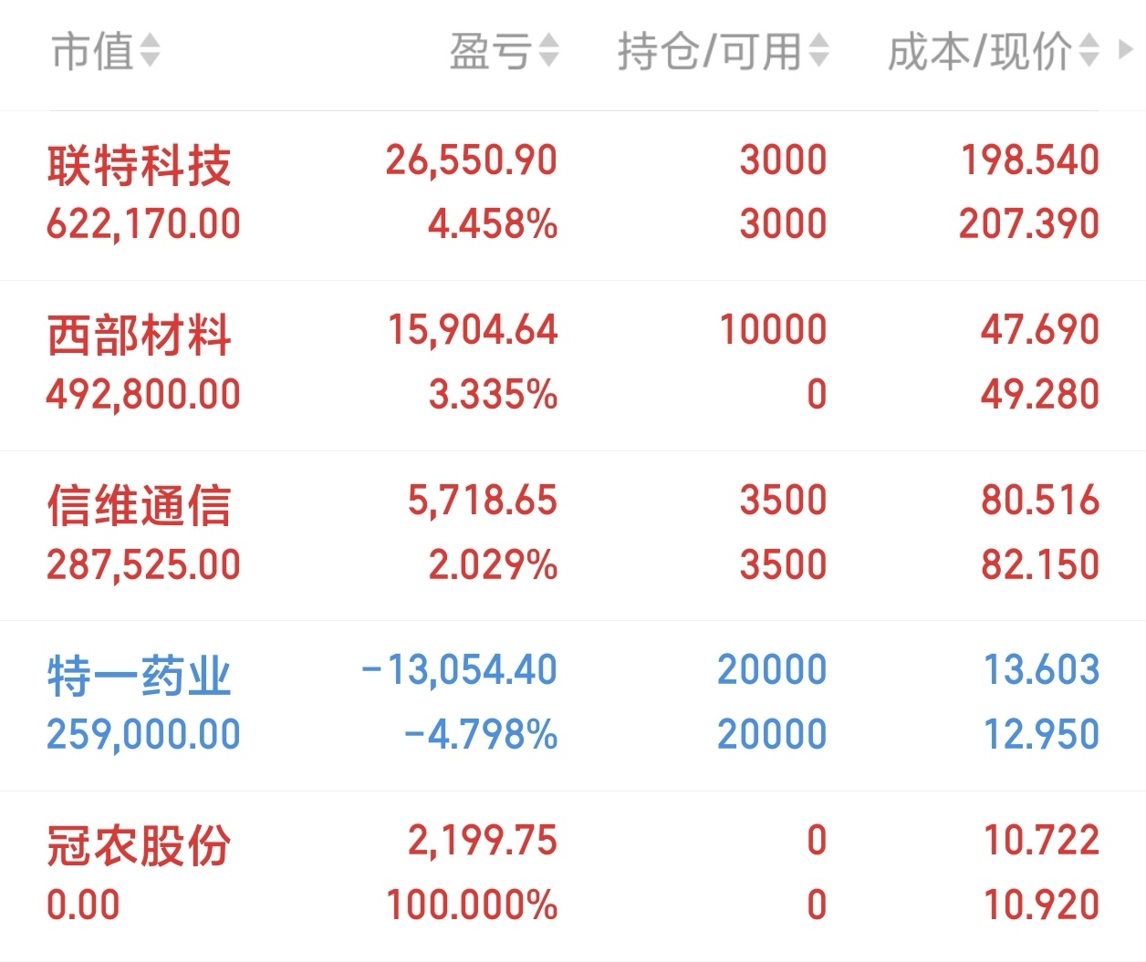 清掉冠农股份,入手了西部材料,今天尾盘表现还可以,就等明天发力了~ 联特科技和信维通信打算继续持有观察,特一药业今天稍显弱势,不过问题不大~