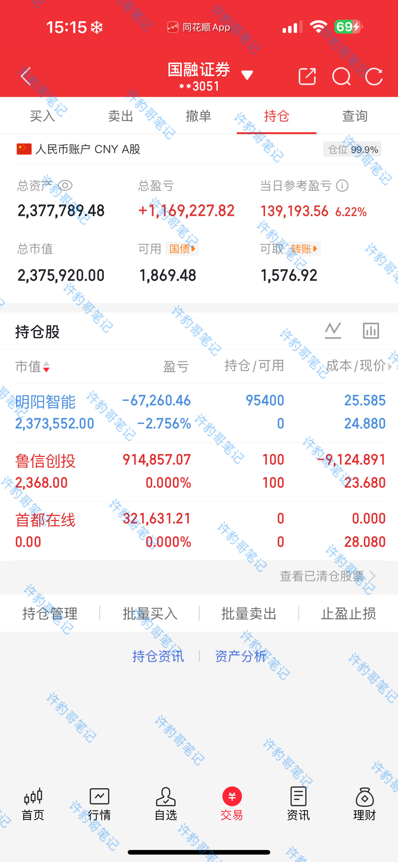 昨天进的首都在线,和我预xiang的差不多,昨晚有li好。今天直接高开后,我就分批出掉了。然后明阳智能,今天低开是正常的,毕竟昨天是大长腿,然后我就等待了一下,明阳智能从水下翻红后,并在均线上方,但是那个盘mian就shi为比较强势,我就进了明阳智能。结果后面表现的很弱了,然后下午tan底后起来的力度还可以的。但还是被均线ya着。