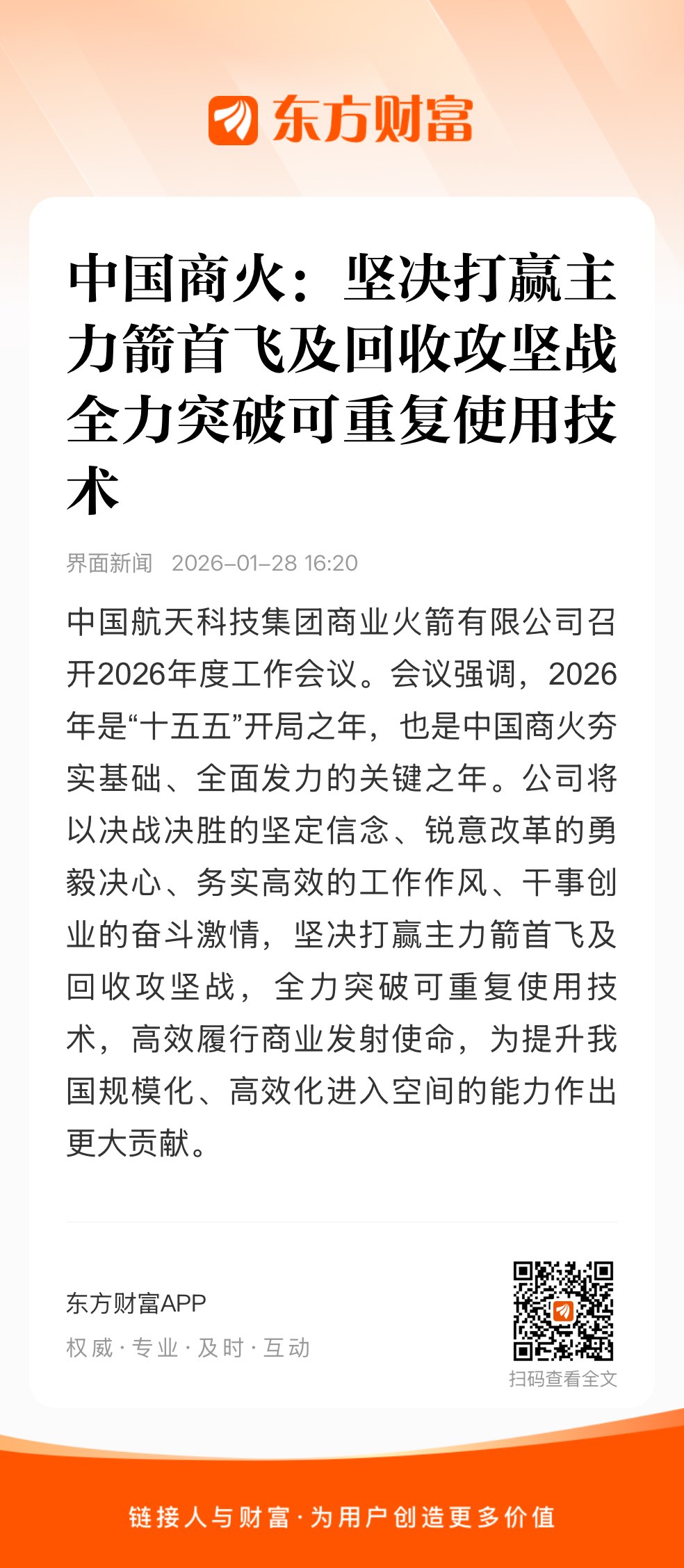 1月27日,中国航天科技集团商业火箭有限公司(简称“中国商火”)召开2026年度工作会议。会议强调,2026年是“十五五”开局之年,也是中国商火夯实基础、全面发力的关键之年。公司将以决战决胜的坚定信念、锐意改革的勇毅决心、务实高效的工作作风、干事创业的奋斗激情,坚决打赢主力箭首飞及回收攻坚战,全力突破可重复使用技术,高效履行商业发射使命,为提升我国规模化、高效化进入空间的能力作出更大贡献。