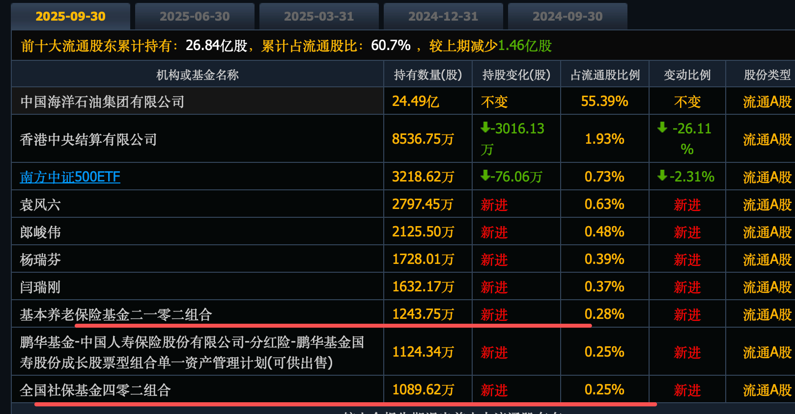 海油工程,养老保险基金2102组合新进1243万股,位列第八大股东,社保基金402组合新进1090万股,位列第十大股东。