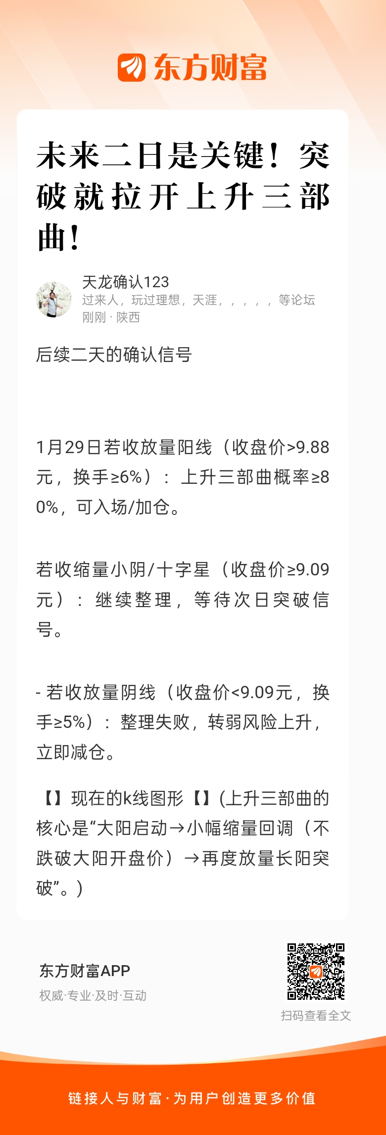 1月29日若收放量阳线(收盘价>9.88元,换手≥6%):上升三部曲概率≥80%,可入场/加仓。
