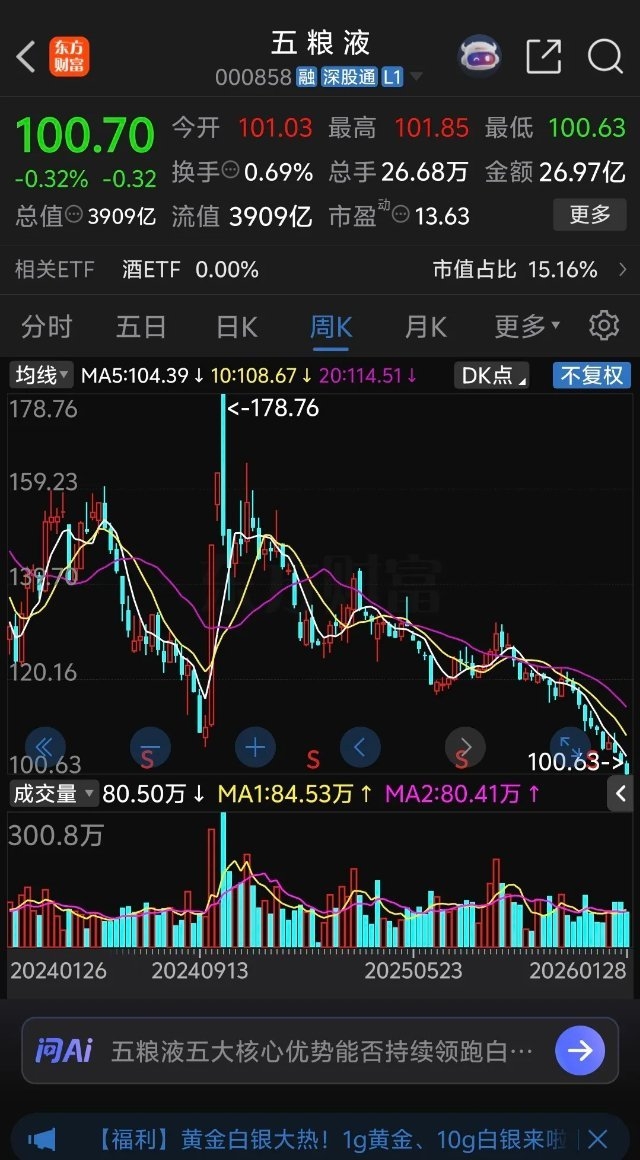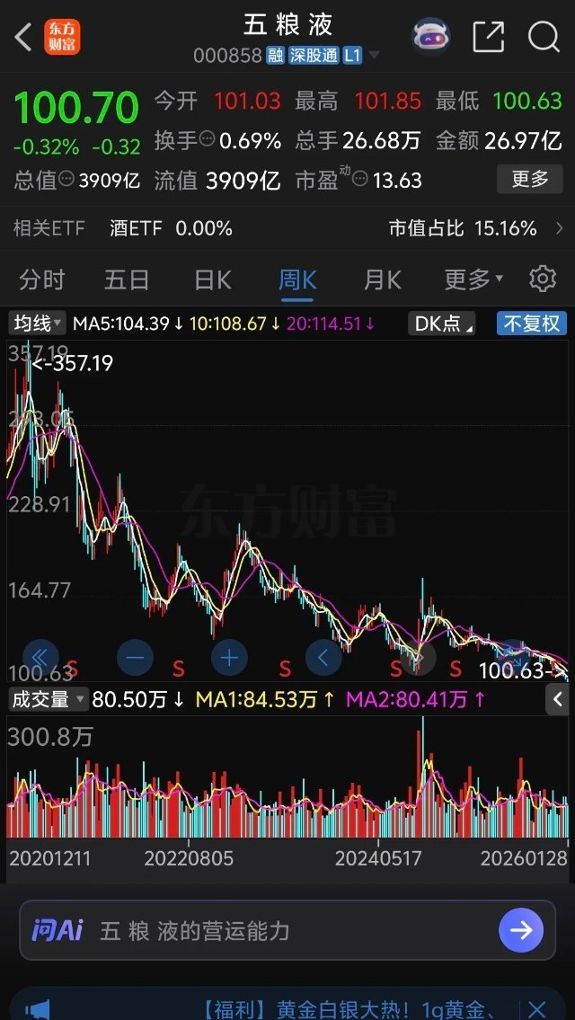 五粮液跌的太惨了,早盘冲高后快速回落下跌,受100关口支撑维持震荡,但是每次抄底资金涌入拉升都是冲高回落,这么低的股价股民仍然源源不断的割肉,今天最低已经跌到100.63不仅创本轮牛市下跌新低,而且跌破9.24行情最低价创近6年新低,股民万万没想到优质股五粮液会从357跌到100,现在股息率高达5.7%远远超过银行存款利率,股民在牛市盲目割肉价值股实在不应该。#银价疯涨后银饰一口价变克重计价#