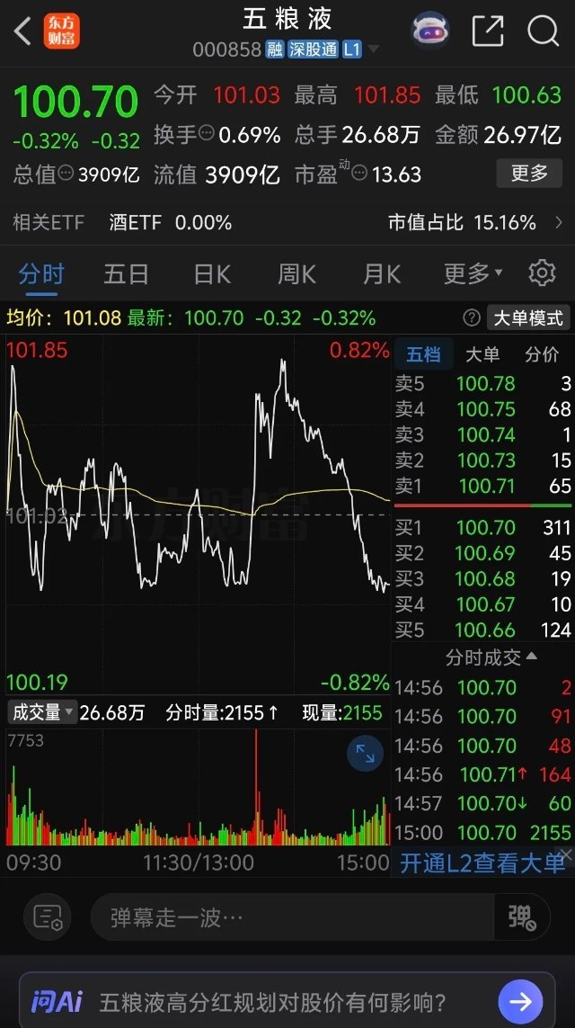 五粮液跌的太惨了,早盘冲高后快速回落下跌,受100关口支撑维持震荡,但是每次抄底