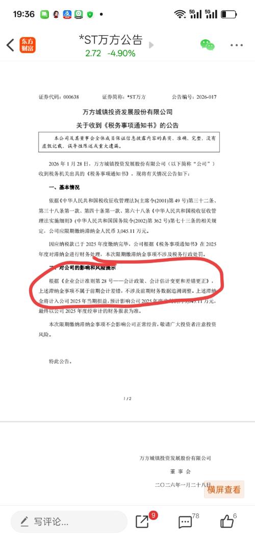 2026 年 1 月 28 日,万方城镇投资发展股份有限公司(以下简称“公司”)