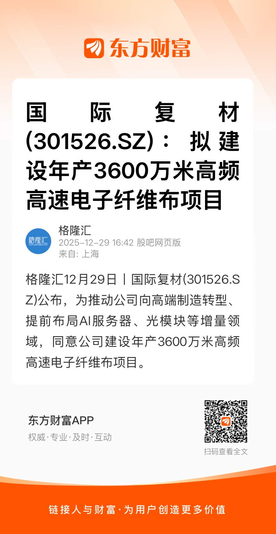 格隆汇12月29日丨国际复材(301526.SZ)公布,为推动公司向高端制造转型、提前布局AI服务器、光模块等增量领域,同意公司建设年产3600万米高频高速电子纤维布项目。