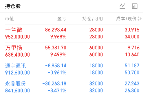 士兰微:今日该股早盘低开后快速拉升盘中触及34.11位置后回落随即进入横盘震荡整理格局。午后临近14:30虽有紫金推动股价拉升但很快遭遇抛压打压,后续延续横盘震荡态势最终收于34位置。基于当前个股走势与盘面环境,我也是继续持仓,期待其明日表现。