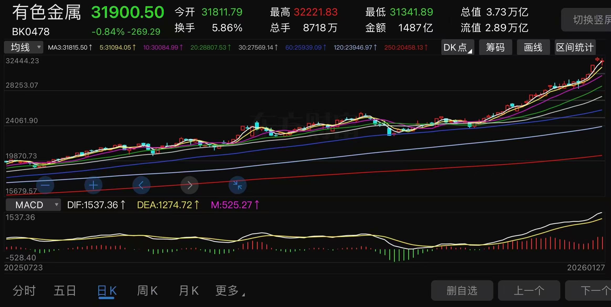 目前有色金属、化工板块走的明显是牛市上涨趋势,这种趋势下需要顺势而为,不能轻易言顶!