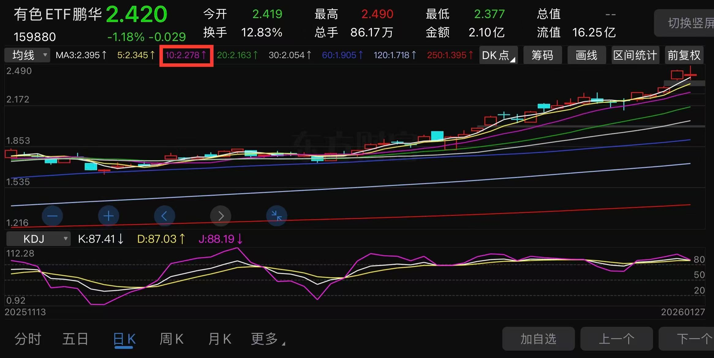 同时,目前159880的10日线与1月21日的收盘价刚好重合在2.278——