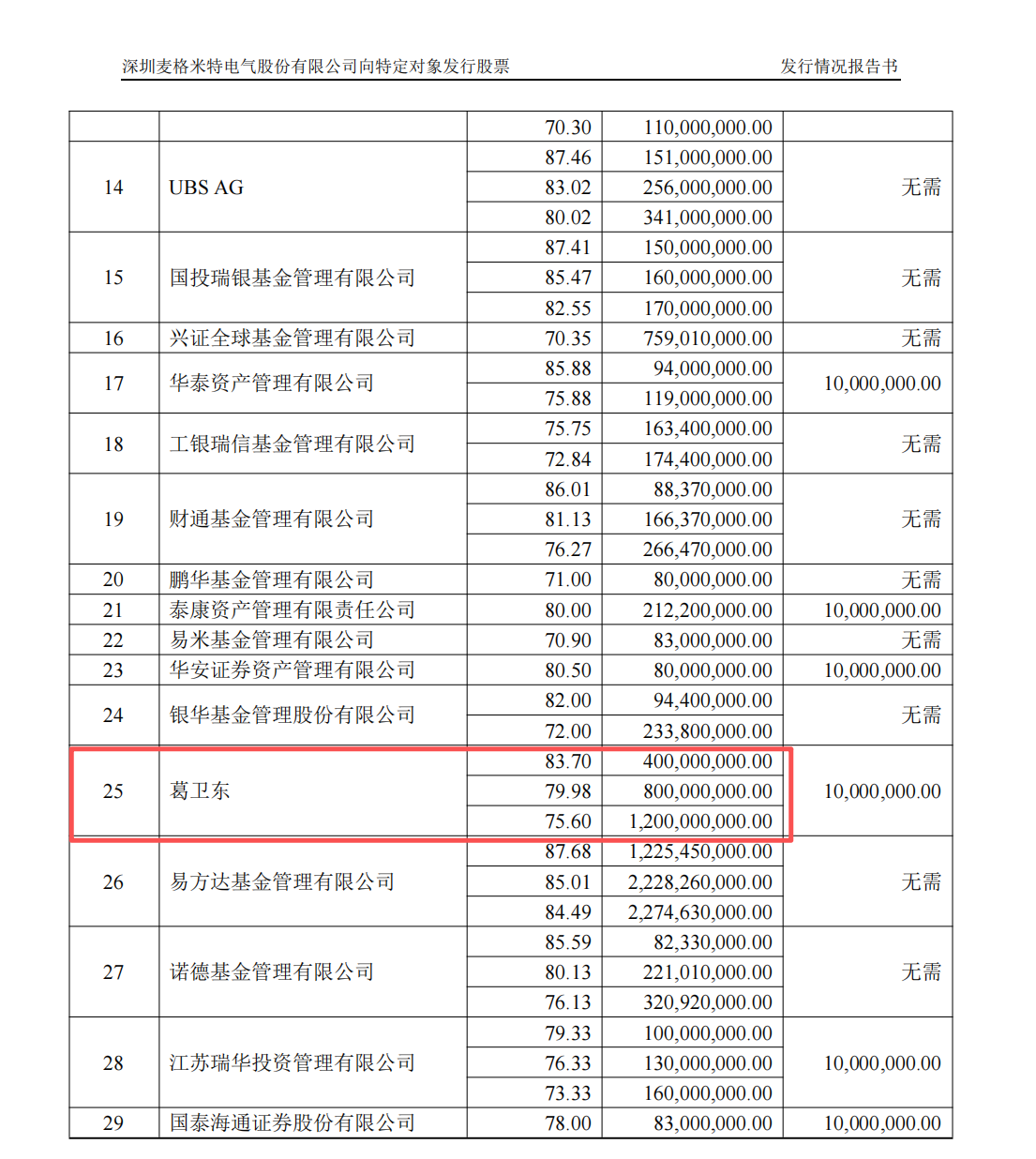 1月26日,麦格米特发布的向特定对象发行股票发行情况报告书显示,知名投资人葛卫东参与其中,申购总金额为24亿元。值得注意的是,2025年三季度末,葛卫东亲属葛贵莲便已经新进成为麦格米特第九大股东,截至2025年末,葛贵莲持有麦格米特606.76万股,持股市值约5.47亿元。