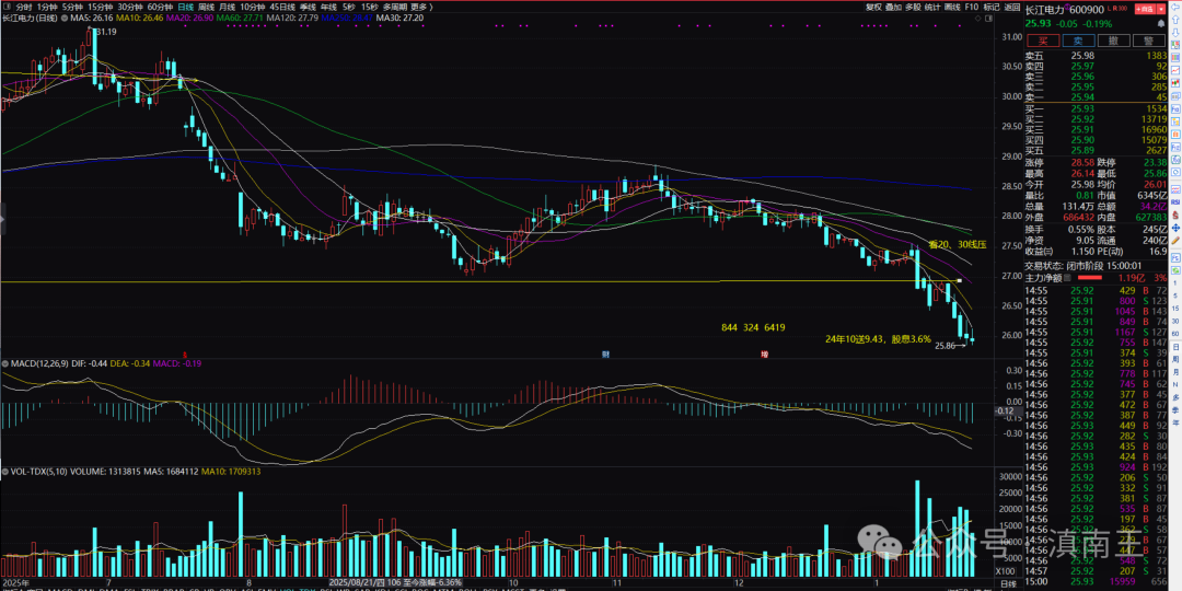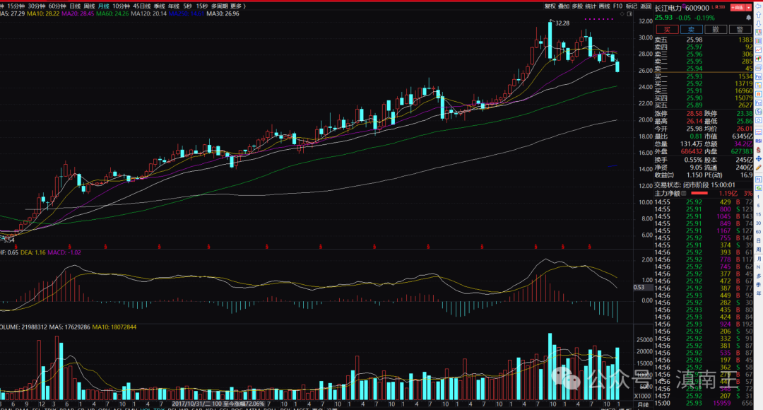 周一25.9埋伏了长江电力,更多的是投资理念的升华!为什么这么说,投资这么多年,真的累了!只想搞点安全点的,吃点股息就行!