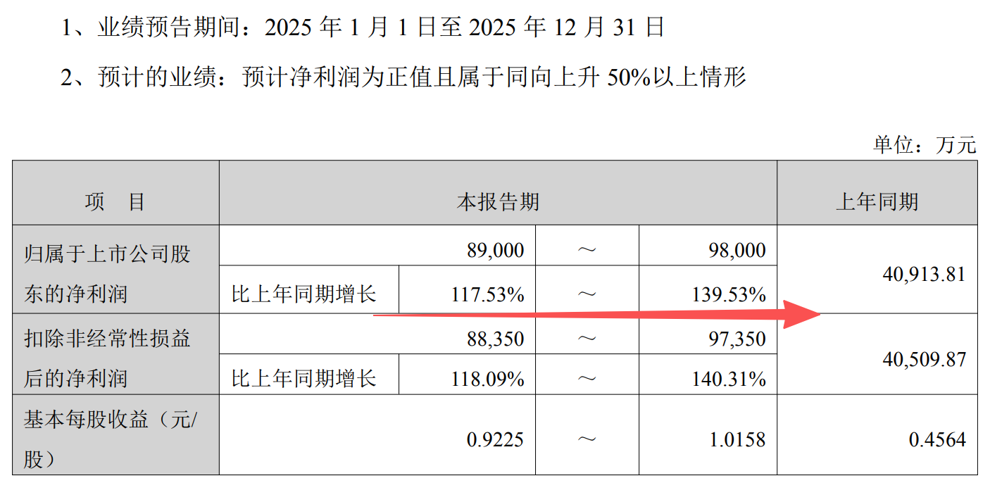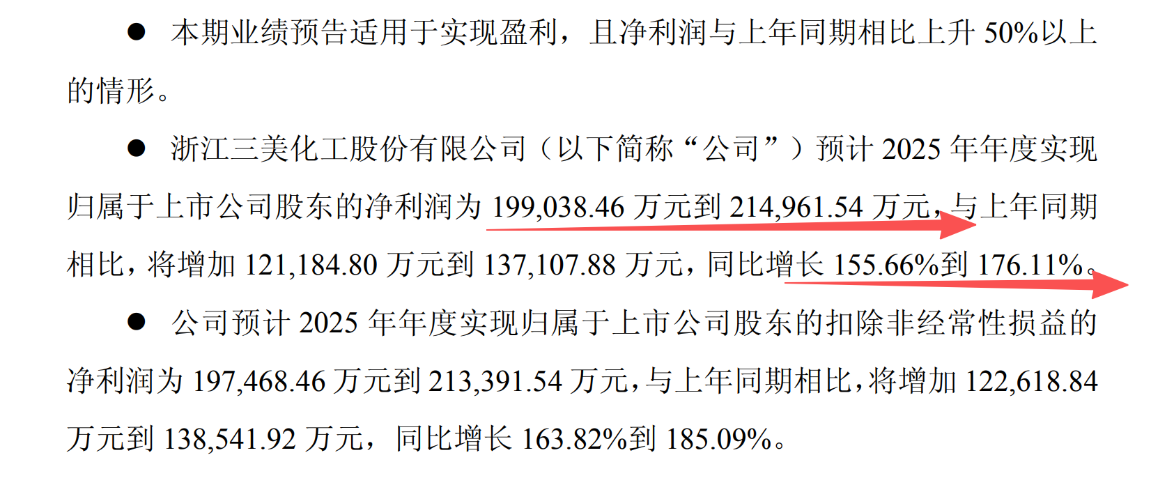 三美股份,2025年净利润增长156%达到176%,净利润达到19.9亿到21.5亿元。