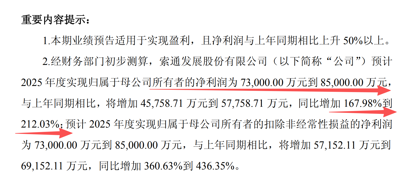 索通发展,这个公司净利润增长168%达到212%。净利润达到7.3亿到8.5亿。