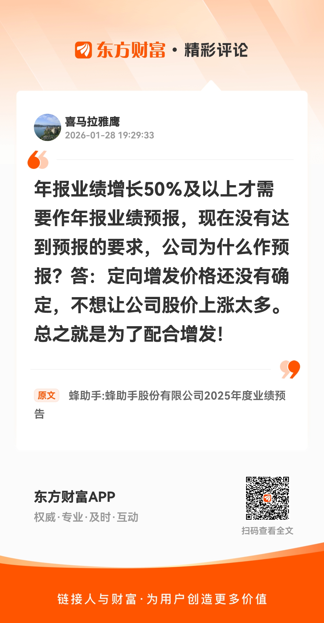 年报业绩增长50%及以上才需要作年报业绩预报,现在没有达到预报的要求,公司为什么作预报?答:定向增发价格还没有确定,不想让公司股价上涨太多。总之就是为了配合增发! 我在《蜂助手:蜂助手股份有限公司2025年度业绩预告》的评论获得了大家的关注。