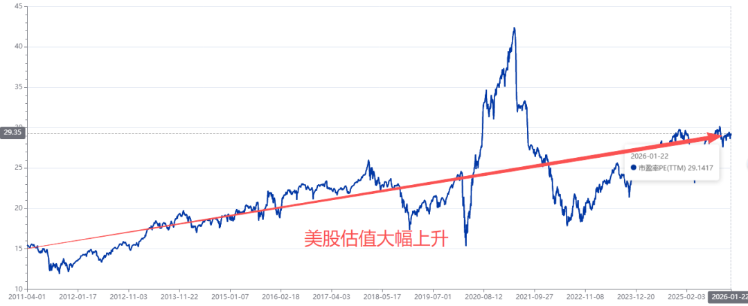 2010年至今,美股PE是从15倍提升到30倍。下图是标普500指数2010年至今的估值走势。