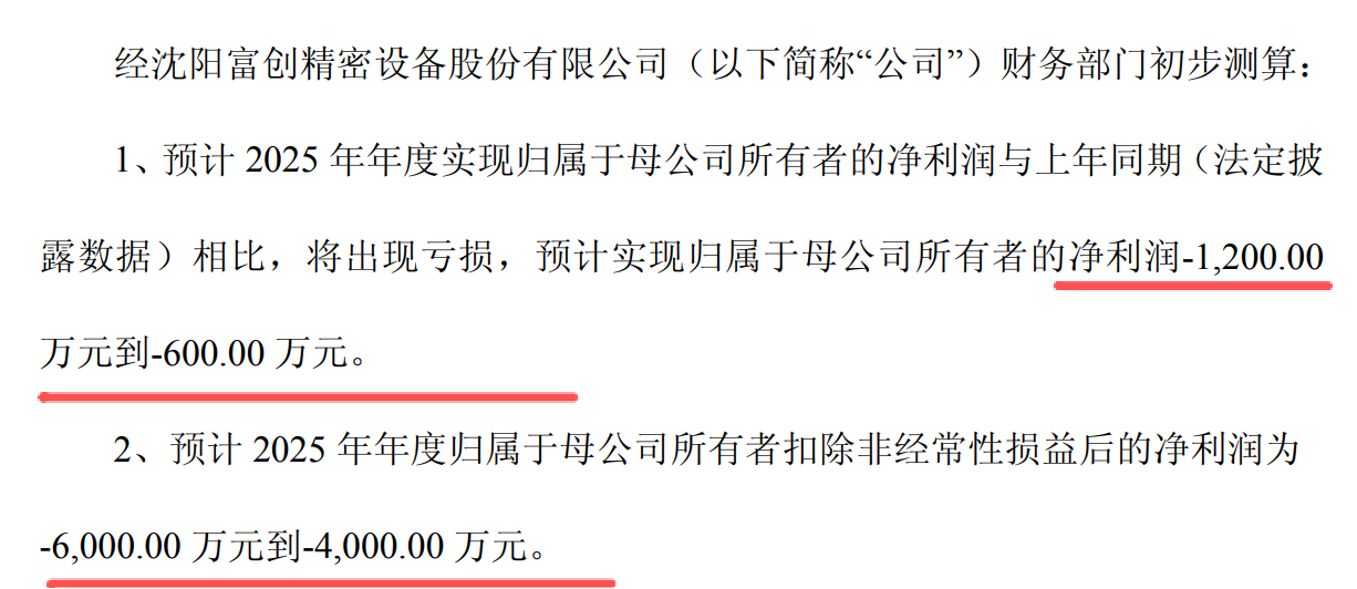 富创精密,这个股票2025年亏损了0.12亿到亏损600万。