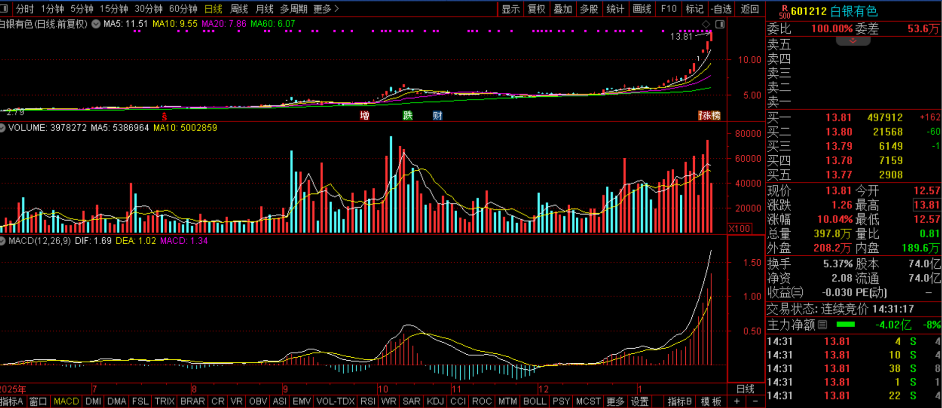 $白银有色(SH601212)$白银有色(SZ601212):黄金+白银+锂电材料+铜铅锌+甘肃国企。该股昨日开盘就大幅拉涨封板,这是趋势的强化,不过已经7连板,短期确实上涨有点过了,有调整需求。因此笔者虽依旧看涨后市,但短期还是要关住下调整风险。料今日此股有望继续高走甚至板,如果今日封板不及的话,可以部分减持,待调整再加。