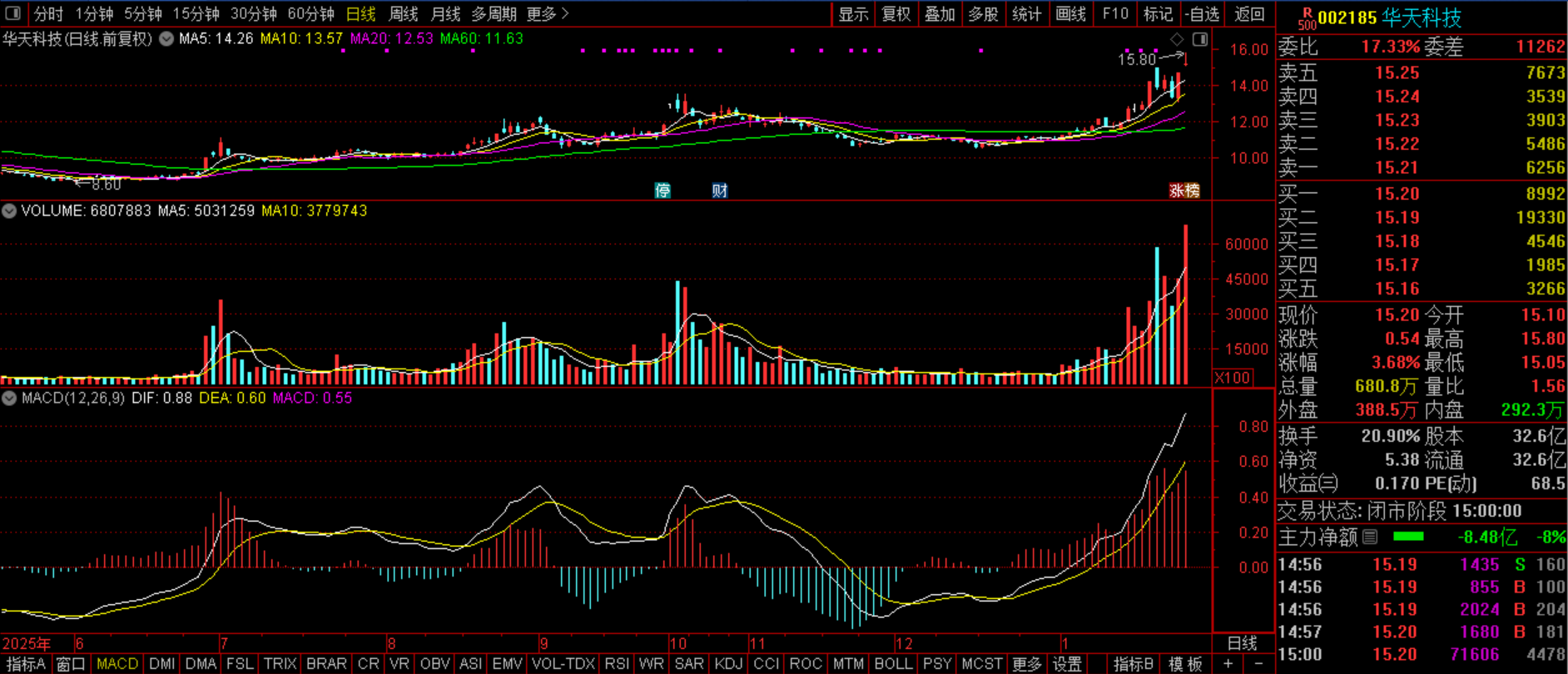 $华天科技(SZ002185)$华天科技(SZ002185):先进封装+CPO概念+华为海思概念+年报增长+收购华羿微电+功率器件+封测龙头+Chiplet。昨日该股放历史巨量大幅回落,复盘时说了短期将有调整,不过这种走势就是猪力的震仓洗盘,后市继续新高是大概率。料今日该股或继续走涨。如早盘强势分歧稳定在14.50上的话,机遇大于风险,可以研究。