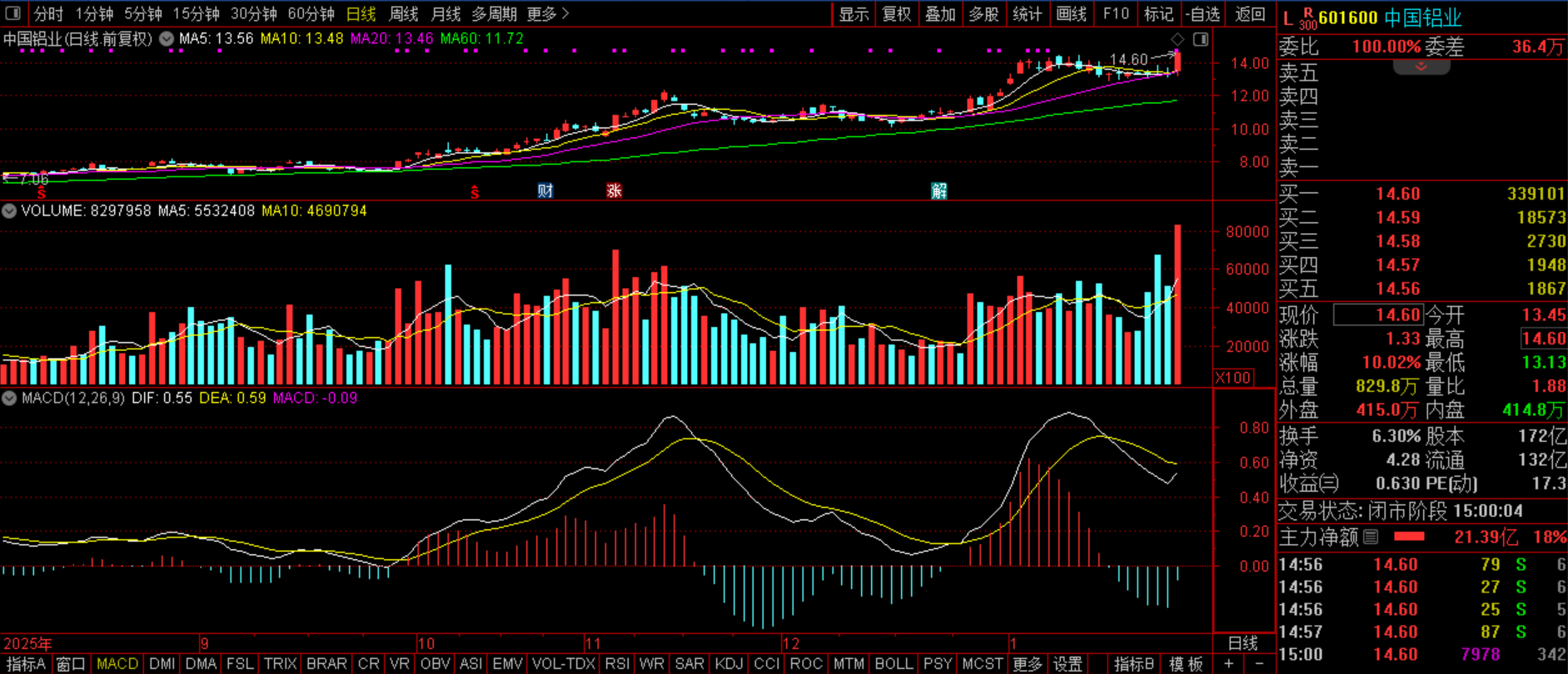 $中国铝业(SH601600)$中国铝业(SZ601600):工业金属+稀土参股+央企+电解铝龙头+业绩增长。该股自2025年下班以来一直缓缓拉涨,有大股东增持、业绩修复以及涨价预期的作用。昨日电解铝突然暴力上涨,打破了震荡格局,后市电解铝行业整体业绩有望继续回升,推动了该股突破上涨的逻辑基础。昨日该股放量拉涨封板,股价创2009年8月以来的新高,这是典型的新趋势的特征。而在基本面方面电解铝目前价格上涨依旧无解,因此未来随着新能源车、电池以及AI的大力发展,其需求量可能会有显著的提升,其可能推动铝价走出一个意外不到的高价,因此该股后市仍具备估值上修预期。料今日该股有望继续走涨新高,只要能稳定在14.00上方都是安全的,不过由于该股是典型的蓝筹大盘股,其上涨速度不会太快,所以要耐得住寂寞,日内强势分歧的话,还是可以研究尝试的。