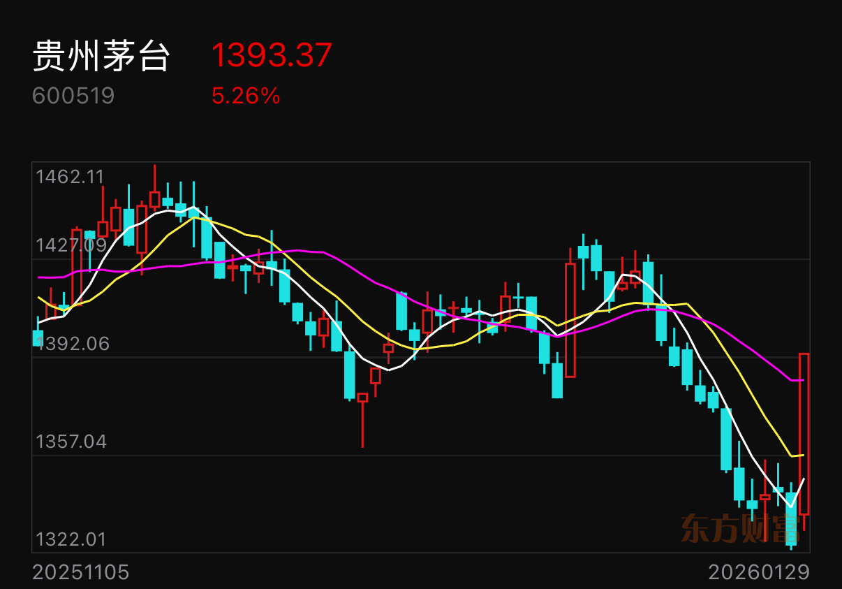 贵州茅台涨幅扩大至5%,现报1393元
