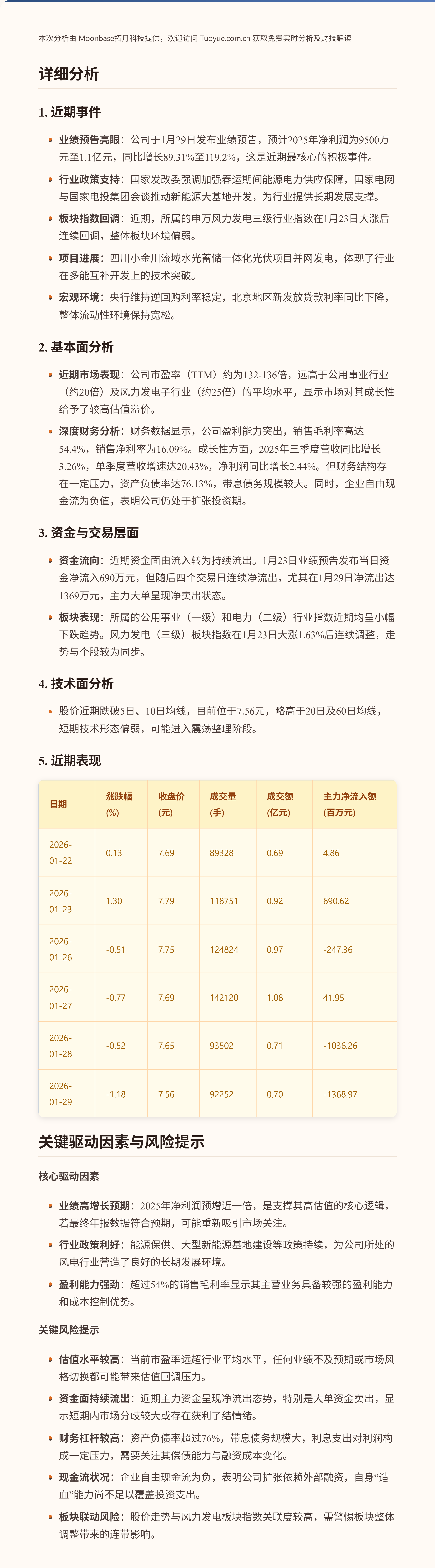 $立新能源(SZ001258)$ 立新能源近期股价呈现震荡下行态势,近六个交易日累计下跌约1.7%。股价表现主要受到公司发布2025年业绩大幅预增公告后,市场情绪短暂提振,但随后资金面持续流出,叠加所属风力发电板块整体回调的影响。关键亮点在于公司预告2025年净利润同比预增89%-119%,显示出强劲的成长性。【欢迎点赞关注反馈!主页有更多精彩解读和分析哦~】