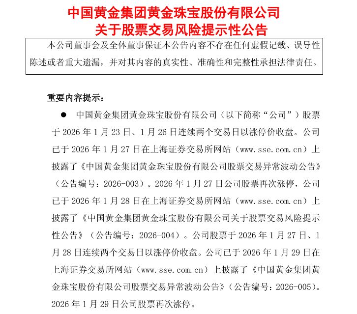 中国黄金发布公告称,公司股票于2026年1月23日、1月26日连续两个交易日以涨停价收盘。公司主营业务未发生变化,主要从事黄金珠宝首饰研发、加工、零售、批发及回购等,未拥有探矿权、采矿权。截至2026年1月29日,公司市盈率为55.63倍,公司所处行业市盈率中位数为28.60倍,公司相关指标明显高于行业平均水平。公司股票交易存在市场情绪过热情形,可能存在短期涨幅较大后的下跌风险。