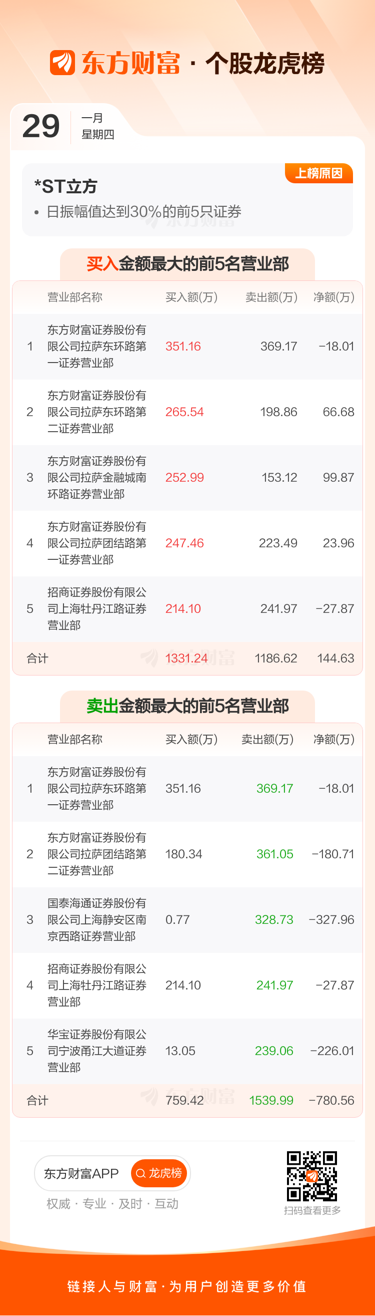 交易所2026年1月29日公布的交易公开信息显示,*ST立方因成为日振幅值达到30%的前5只证券上榜。*ST立方当日收报1.93元,涨跌幅19.88%,偏离值34.03%,换手率23.55%,成交额2.68亿。