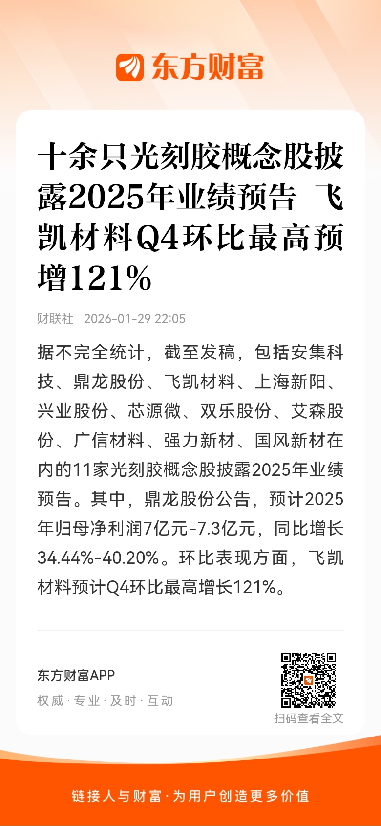 据不完全统计,截至发稿,包括安集科技、鼎龙股份、飞凯材料、上海新阳、兴业股份、芯源微、双乐股份、艾森股份、广信材料、强力新材、国风新材在内的11家光刻胶概念股披露2025年业绩预告。其中,鼎龙股份公告,预计2025年归母净利润7亿元-7.3亿元,同比增长34.44%-40.20%。环比表现方面,飞凯材料预计Q4环比最高增长121%。