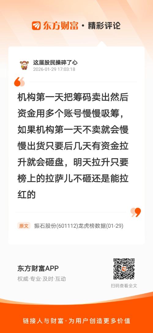 机构第一天把筹码卖出然后资金用多个账号慢慢吸筹,如果机构第一天不卖就会慢慢出货只要后几天有资金拉升就会砸盘,明天拉升只要榜上的拉萨儿不砸还是能拉红的 我在《振石股份(601112)龙虎榜数据(01-29)》的评论获得了大家的关注。