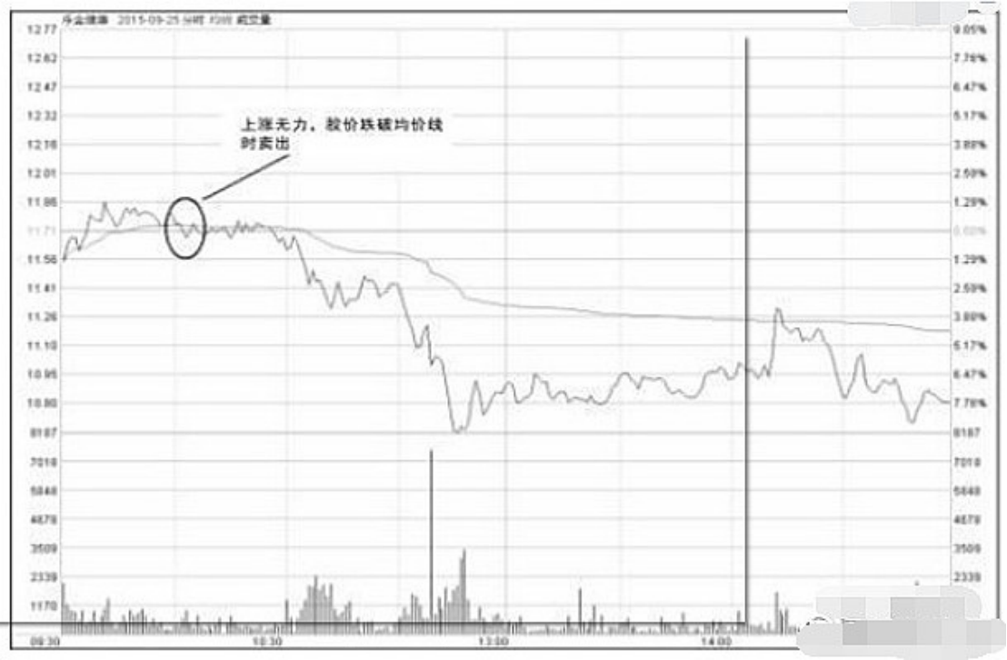股价一直在均价线之上运行,不破就安全持股,一旦跌破了,那么就是卖点。所以,跌破均价线就说明分时图破位,股价将选择弱势运行,投资者要提防随后的下滑风险,应当卖出为上(如图3-4所示)。如果随后股价走稳了,继续站稳均价线,那投资者便可以买入。所以,投资者操作要灵活应对,不能拖泥带水。