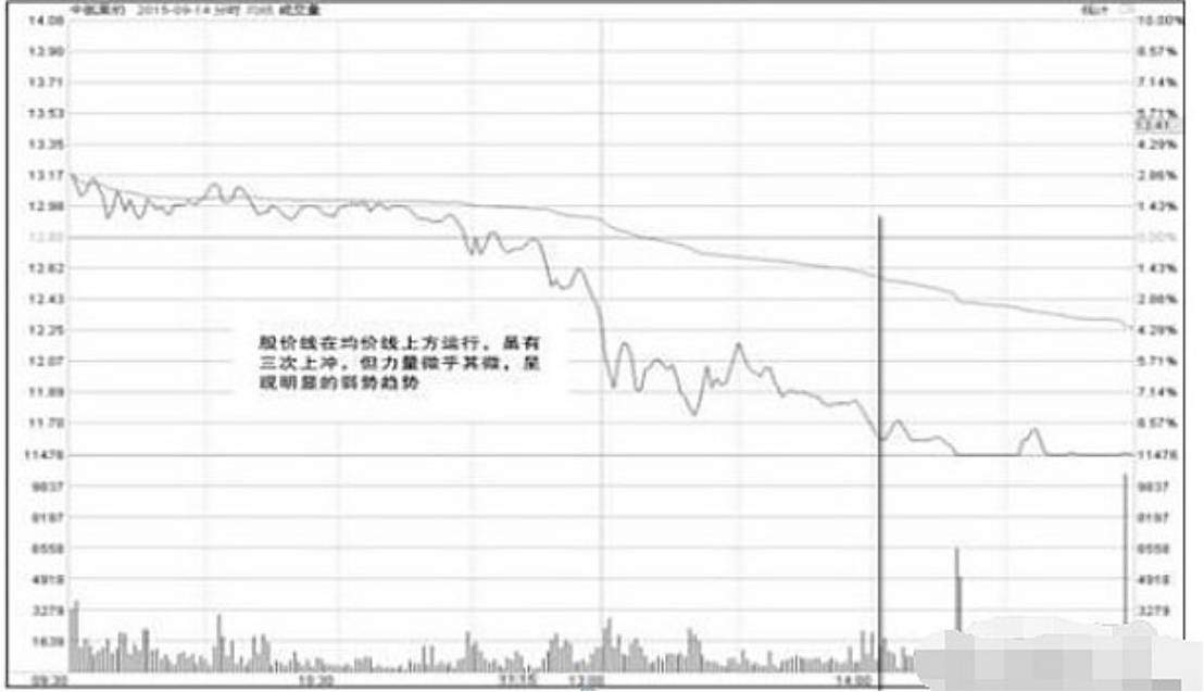 6、当股票往上拉升时发现分时量没有集中放大,量能不齐表明主力做多不够坚决,理应卖出为主;