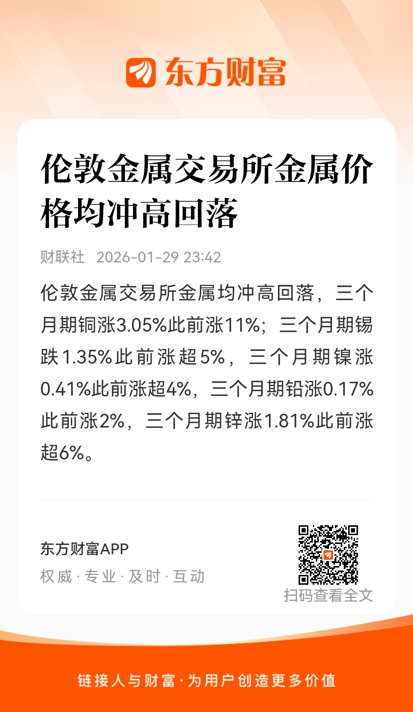 伦敦金属交易所金属均冲高回落,三个月期铜涨3.05%此前涨11%;三个月期锡跌1.35%此前涨超5%,三个月期镍涨0.41%此前涨超4%,三个月期铅涨0.17%此前涨2%,三个月期锌涨1.81%此前涨超6%。