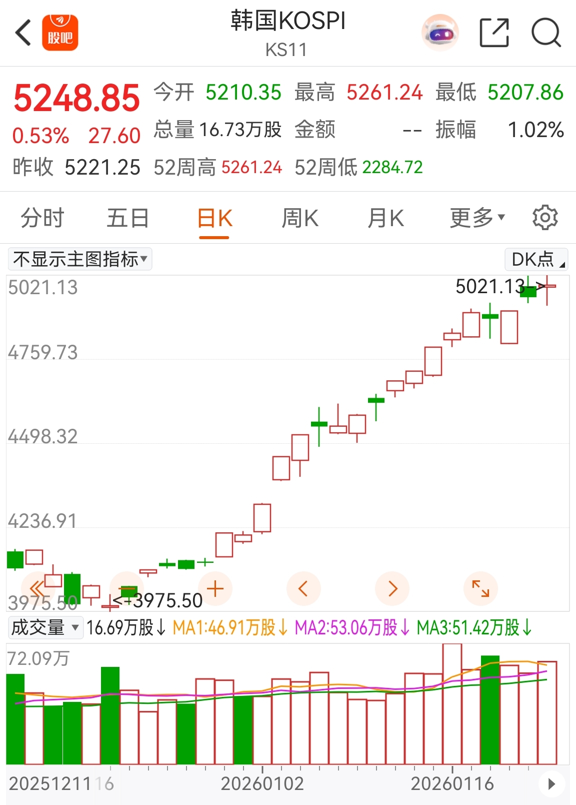 韩国股市开盘再创历史新高!目前,韩国股市KOSPI最高已经5261.24点了!在