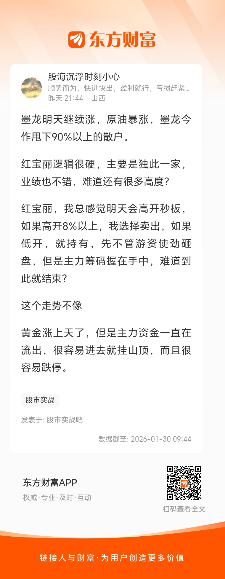 温馨提示: 1.根据《证券法》规定,禁止编造、传播虚假信息或者误导性信息,扰乱证券市场;2.用户在本社区发表的所有资料、言论等仅代表个人观点,与本网站立场无关,不对您构成任何投资建议。用户应基于自己的独立判断,自行决定证券投资并承担相应风险。《东方财富社区管理规定》