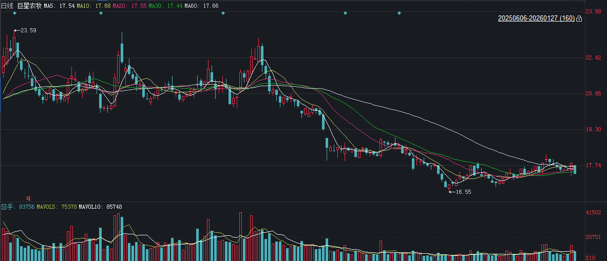 二级市场上,截至1月27日收盘,巨星农牧下跌2.58%报17.35元/股,总市值约88.50亿元,近一年来公司股价近乎“原地踏步”。