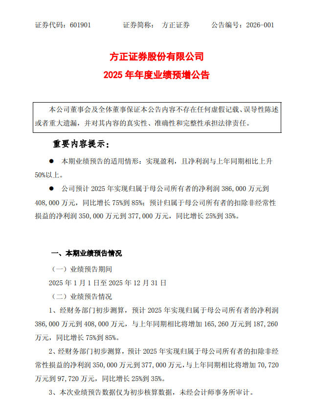 【方正证券:预计2025年归母净利润38.6亿元-40.8亿元,同比增长75%-