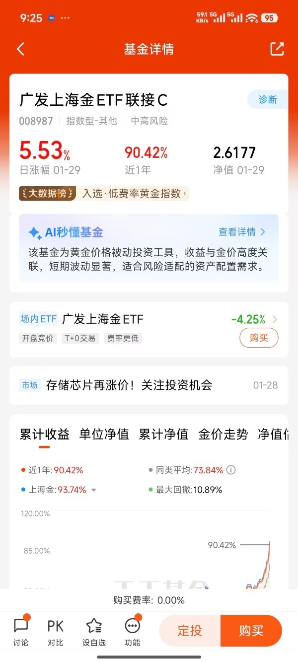 黄金这势头真是挡不住,前几天刚站稳5000美元,这就往5400冲。拿的广发上海金